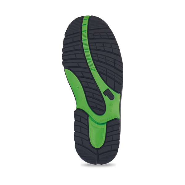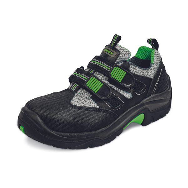 Safety sandals with composite toe cap, antistatic, antislip, oil resistant PU/TPU/TPU sole. Upper is a combination of the following materials: Durable micro channel, extremely breathable mesh; high quality natural grain leather with "Rufi no" fi nishing around toe cap and heel part with a combination of high quality grain "crazy horse" leather with protective wax fi nishing. Fluorescent nylon inserts for increased visibility. Additional protection of the toe cap.