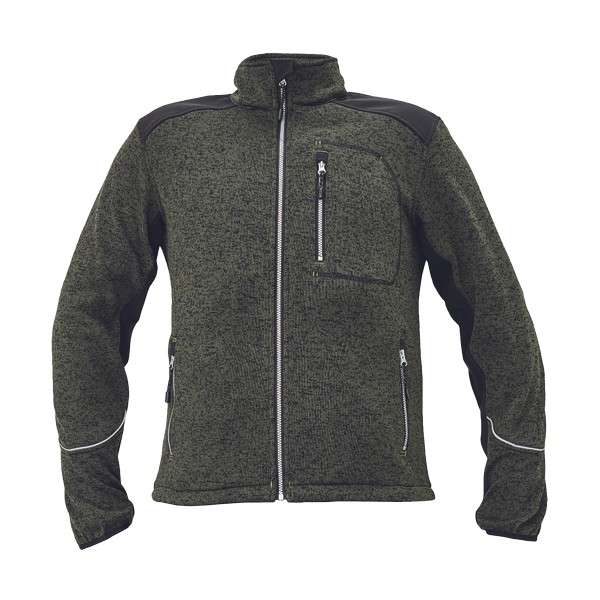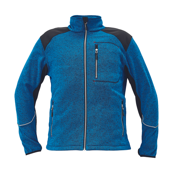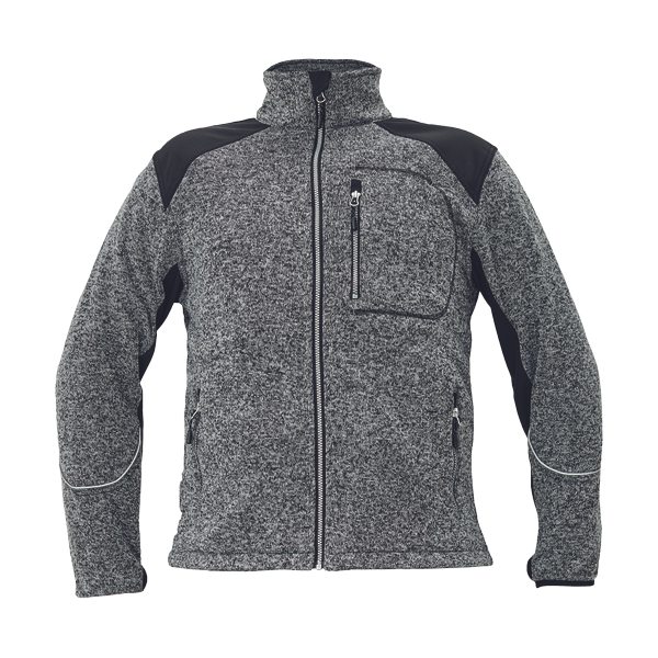 Pánská bunda na zip z melanžového úpletu s kartáčovanou vnitřní stranou; zesílené ramenní a rukávové části ze softshellu v kontrastní barvě; 1 náprsní kapsa na zip; 2 boční kapsy na zip; nastavitelný spodní lem stahovací šňůrkou; otvor pro palec na manžetě rukávu.
