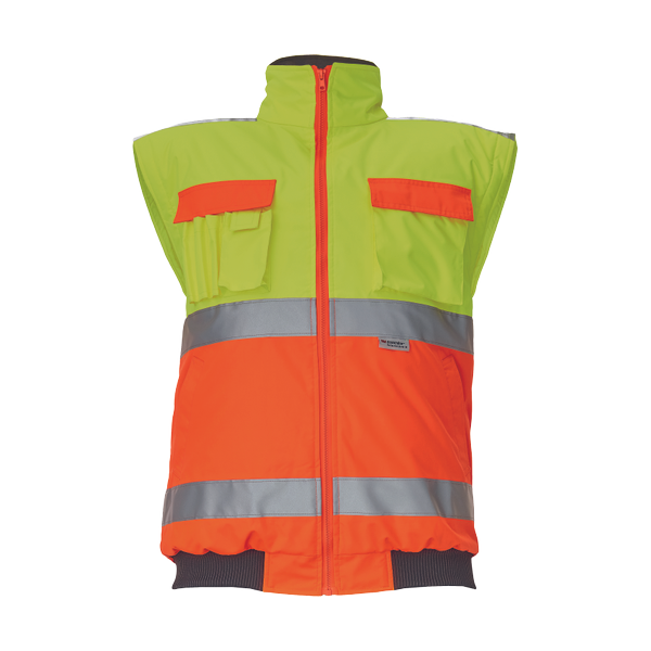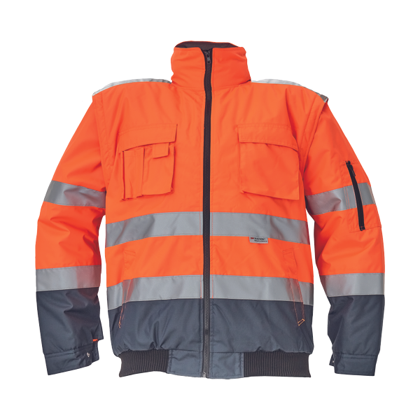 pánská HI-VIS a nepromokavá zimní bunda s odepínacími rukávy; kapuce v límci, prodyšné, zatavené švy; 3M reflexní pruhy kolem pasu a rukávů; 2 boční kapsy, 2 náprsní kapsy, 1 kapsa na levém rukávu; úprava lemu rukávů elastický pas.