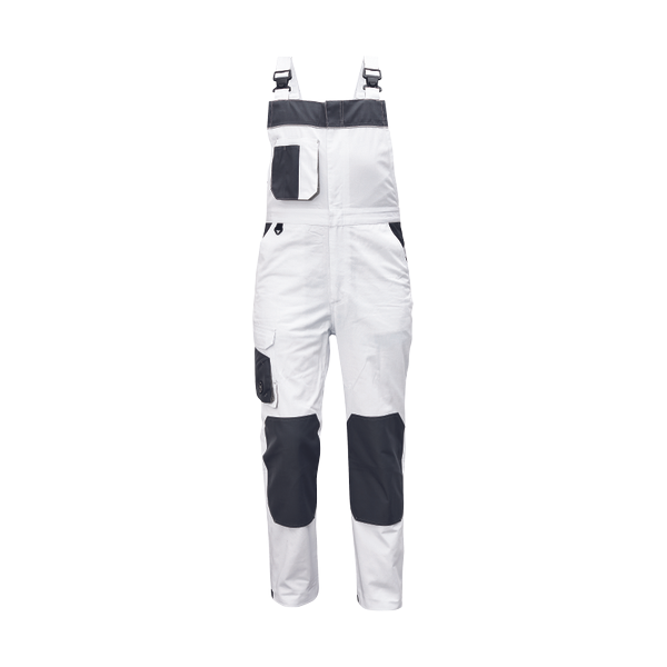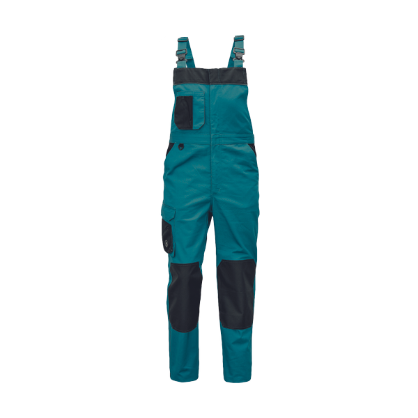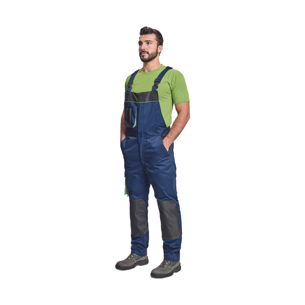 Pánské pracovní kalhoty s náprsníkem a elastickým pasem; zesílené kolenní kapsy z materiálu Oxford 600D s otvory pro chrániče kolen; 5 multifunkčních kapes; kontrastní lemování; možnost prodloužení nohavic.