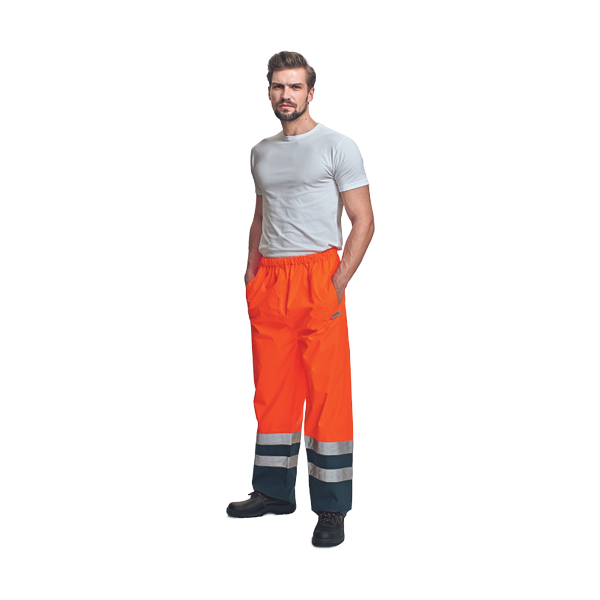 men's lightweight HI-VIS pants with 3M reflective strips around bottom legs, taped seams; high water resistance, permeable; adjustable leg bottom hems with plastic press studs.
