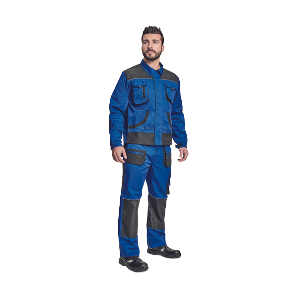 pánská pracovní bunda; zapínání na zip kryté légou na suchý zip; 2 náprsní kapsy se zapínáním na suchý zip; 2 multifunkční boční kapsy; polyesterové lokty a ramena vyztužené Oxfordem.