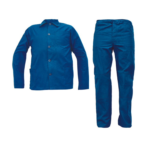 men's working set; jacket with collar and button closure, 2 side pockets, 1 chest pocket; working pants with 2 side pockets, 1 back pocket and waist string tie.