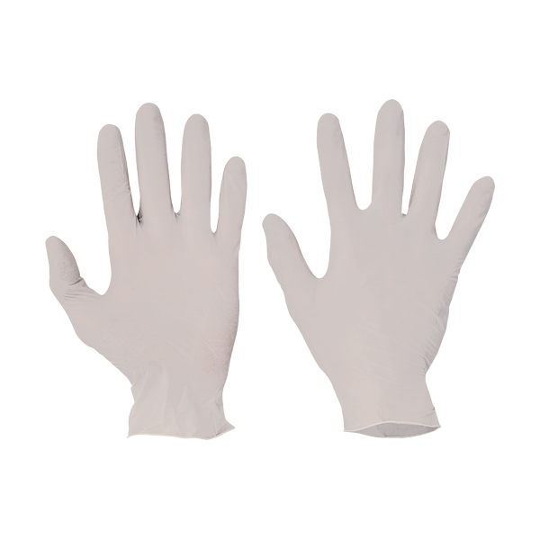 Disposable latex powdered gloves suitable for short term contact with foods. Gloves attested for direct contact with fatty food. Box contains 100 pcs.