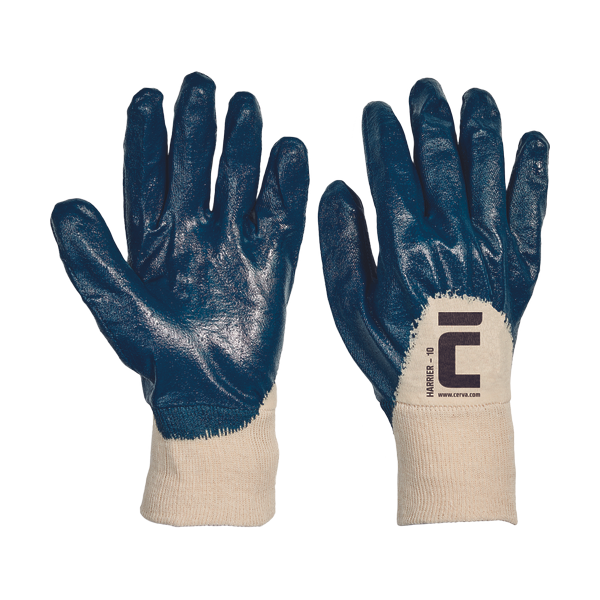 Sewn gloves from cotton interlock, half dipped in nitrile, with elastic cuff.