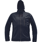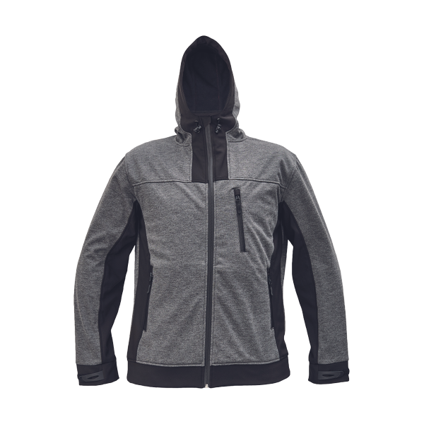 men's zipper softshell jacket with hood; water resistant membrane, breathable; 2 side zipper pockets; 1 zipper chest pocket; velcro cuff adjustment; elastic string in hood.