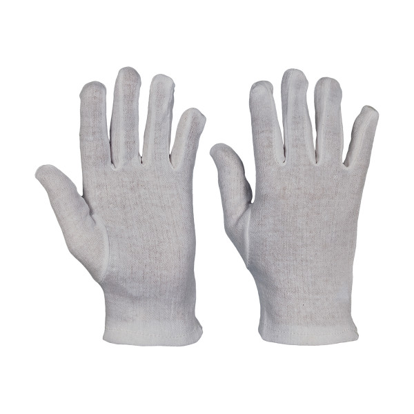 Šité rukavice bez manžety z jemné bělené bavlny a polyesteru podle metody čtyřčipového střihu.