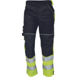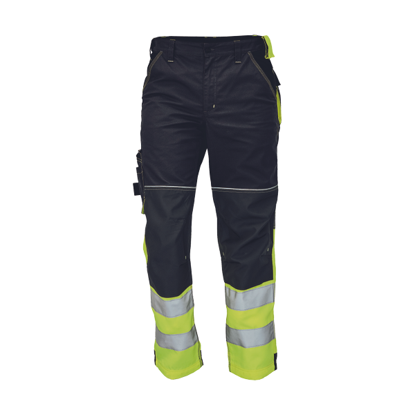 high quality men's working pants in combination with HI-VIS fabric in the bottom of the legs and 2 reflective stripes; elastic waist; 5 functional pockets; 600D Oxford reinforced knee parts for knee pads insertion; extendable length of legs of 5 cm; decorative stitching and contrast details in HI-VIS colour.