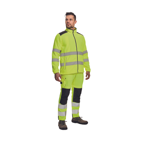 HI-VIS zipper fleece jacket from antipilling polyester fleece fabric; reinforced shoulders and elbow parts; saddle and side pockets bordered by reflective piping; adjustable bottom girth by draw string; adjustable sleeves by Velcro; decorative stitching in contrast colour.