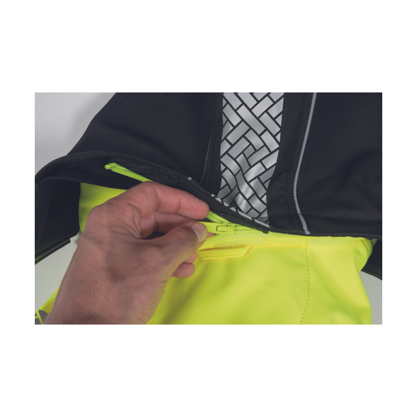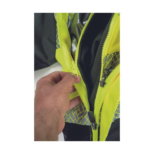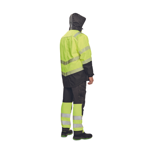 pánská větruodolná a nepromokavá bunda HI-VIS s odepínatelnou kapucí; zapínání na zip kryté klopou na suchý zip; nastavitelný spodní obvod stahovací šňůrkou; nastavitelné rukávy na suchý zip; 2 boční kapsy na zip; 1 hrudní kapsa na zip; 1 vnitřní kapsa na zip; 100% PES termoizolační podšívka; reflexní potrubí a segmentované reflexní pruhy; vnitřní poutka pro uchycení volitelných bund.