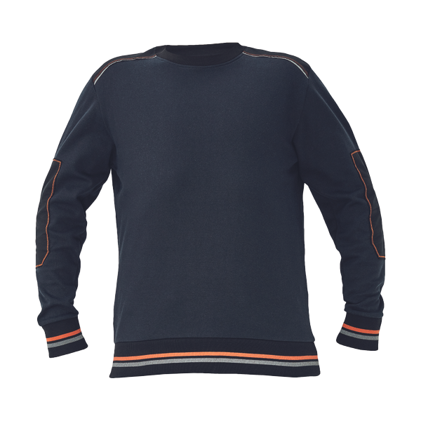 sweatshirt with round neck from mix of cotton and polyester, french terry brushed inside; shoulders saddle with reflective piping; reinforced elbow parts; contrast stripes in sleeve and bottom hems; decorative stitching in HI-VIS colour.