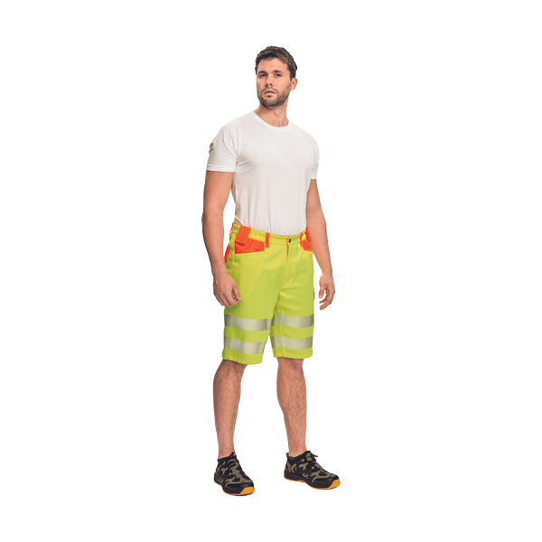 vysoce kvalitní pánské pracovní šortky v kombinaci dvou barev HI-VIS; segmentované tištěné reflexní pruhy kolem stehen; 2 velké přední kapsy, 1 multifunkční boční kapsa na nohavici, 2 zadní kapsy s klopou; elastický pas.