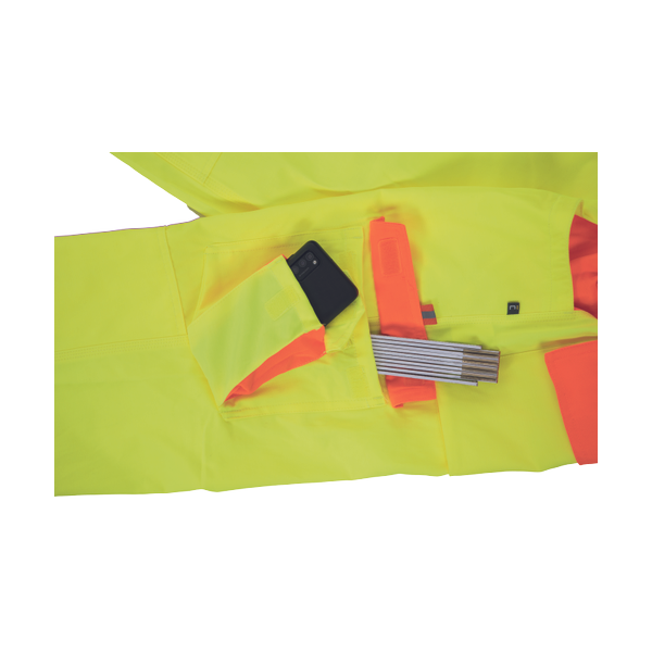 vysoce kvalitní pánské pracovní kalhoty v kombinaci dvou barev HI-VIS; segmentované tištěné reflexní pruhy kolem dolních končetin; 2 velké přední kapsy, 1 dvojitá multifunkční levá boční kapsa na nohavici, 2 zadní kapsy s klopou; kolenní kapsy pro vložení chrániče kolen; elastický pas.