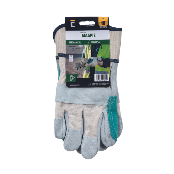 Gloves with cowsplit leather double layer reinforced palm with lining, white cotton fabric back and tough cuff.