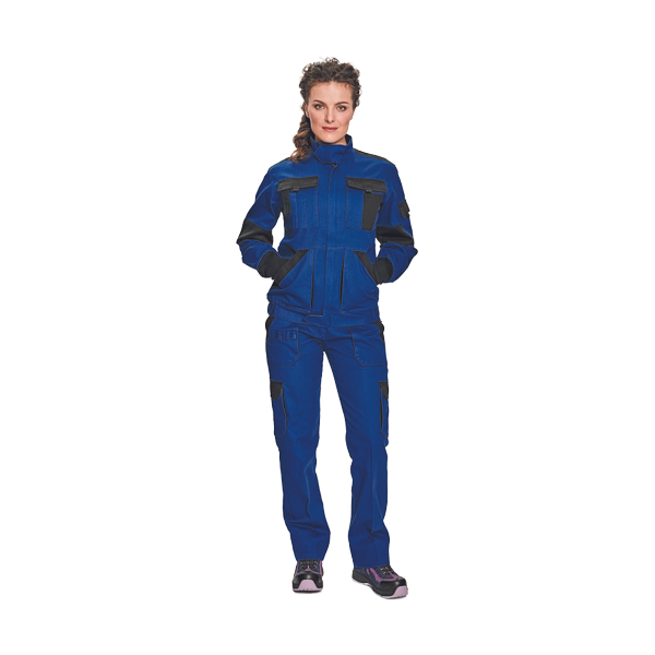 lady´s working jacket with zipper closure and placket cover; 2 front pockets, 2 chest double pockets with flaps; 1 small pocket on left sleeve; reinforcement in stressed parts of shoulders and elbows; elastic cuffs and bottom waist hem.