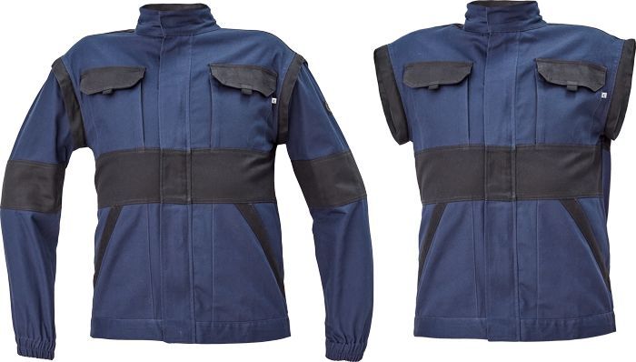pánská pracovní bunda se zapínáním na zip a krytem kapes; odnímatelné rukávy; 2 přední kapsy, 2 náprsní kapsy; zesílení v namáhaných částech ramen a loktů; elastické manžety a spodní lem v pase.