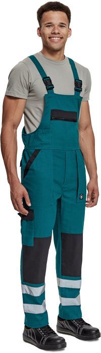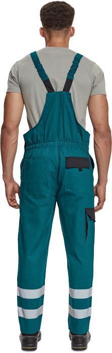 pánské pracovní kalhoty s elastickým pasem; široké rovnátka s plastovými sponami; 2 boční kapsy, 1 stehenní kapsa; 1 velká náprsní kapsa, 2 zadní kapsy; reflexní pruhy na spodní části nohavic; zesílení kolenních částí.