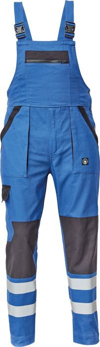 pánské pracovní kalhoty s elastickým pasem; široké rovnátka s plastovými sponami; 2 boční kapsy, 1 stehenní kapsa; 1 velká náprsní kapsa, 2 zadní kapsy; reflexní pruhy na spodní části nohavic; zesílení kolenních částí.