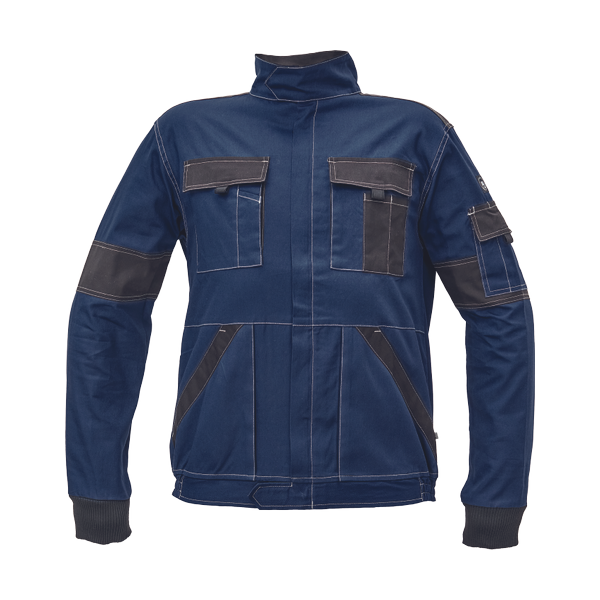 men´s light working jacket with zipper closure and placket cover; 2 front pockets, 2 chest double pockets with flaps; 1 small pocket on left sleeve; reinforcement in stressed parts of shoulders and elbows; elastic cuffs and bottom waist hem.