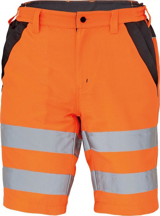 pánské pracovní šortky HI-VIS s elastickým pasem; 2 boční kapsy, 2 zadní kapsy; dva 7 cm tištěné reflexní pruhy kolem stehenních částí; reflexní potrubí.