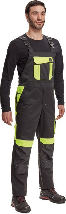 pánské pracovní kalhoty s elastickým pasem; široké rovnátka s plastovými sponami; 2 boční kapsy, 1 dvojitá levá stehenní kapsa; 1 velká náprsní kapsa, 2 zadní kapsy, 2 malé zadní kapsy na pravém stehně; reflexní potrubí; Vyztužení kolenních částí Oxford 600D s klopnými kapsami pro vložení chrániče kolen; prodloužitelná délka nohou.