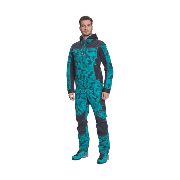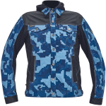 men's working jacket with detachable hood and metal poppers in trendy camou print; elastic inovative fabric TRIFIBETEX® in combination with four way stretch nylon TRIFIBETEXPRO®; tripple stitching, CORDURA shoulder reinforcement; 2 side pockets, 2 chest jeans pockets; adjustable sleeves with poppers; reflective details tone in tone.