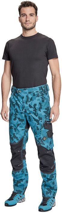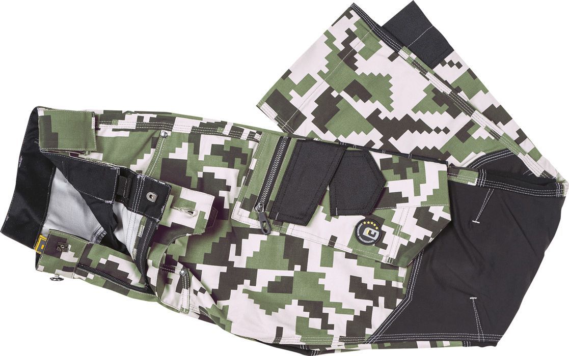 pánské pracovní kalhoty s elastickým pasem; elastický inovativní materiál TRIFIBETEX® s trendovým maskáčovým potiskem; trvanlivé trojité šití nohou a rozkroku; Výztuhy CORDURA v kolenních partiích; prostorné multifunkční přední kapsy s popruhy na nářadí; reflexní detaily tón v tónu; prodloužitelná délka nohou.