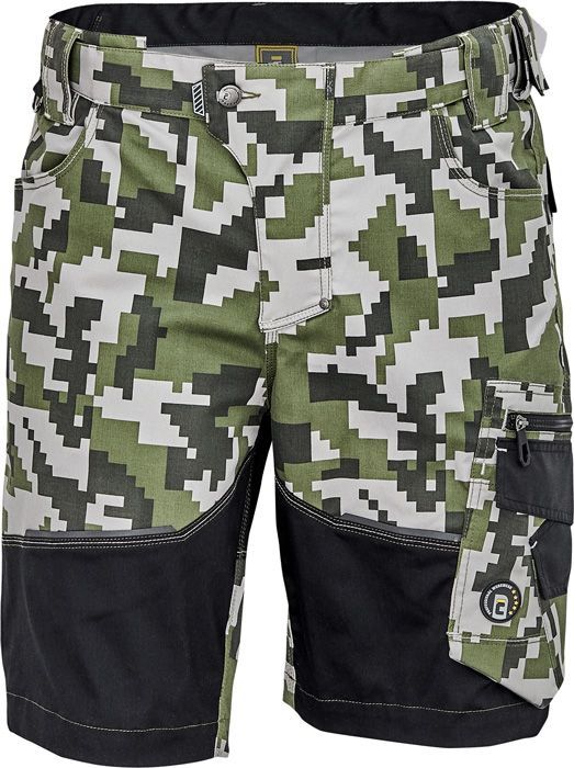 pánské pracovní šortky s elastickým pasem; elastický inovativní materiál TRIFIBETEX® s trendovým maskáčovým potiskem; trvanlivé trojité šití nohou a rozkroku; prostorné multifunkční přední kapsy s popruhy na nářadí; reflexní detaily tón v tónu.