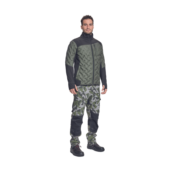 pánské pracovní kalhoty s elastickým pasem; elastický inovativní materiál TRIFIBETEX® s trendovým maskáčovým potiskem; trvanlivé trojité šití nohou a rozkroku; Výztuhy CORDURA v kolenních partiích; prostorné multifunkční přední kapsy s popruhy na nářadí; reflexní detaily tón v tónu; prodloužitelná délka nohou.