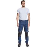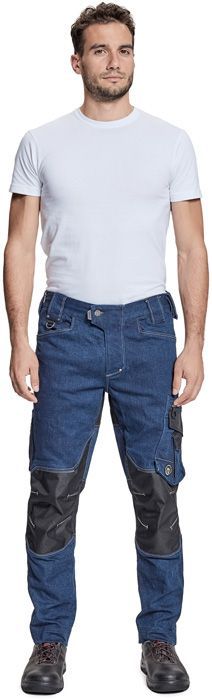 pánské pracovní kalhoty s elastickým pasem; předpraná džínová tkanina v kombinaci s materiálem TRIFIBETEX PRO a TRIFIBETEX; trvanlivé trojité prošívání nohou a rozkroku, kolenní části vyztužené CORDURA a TRIFIBETEX; prostorné multifunkční přední kapsy s popruhy na nářadí; prodloužitelná délka nohou.