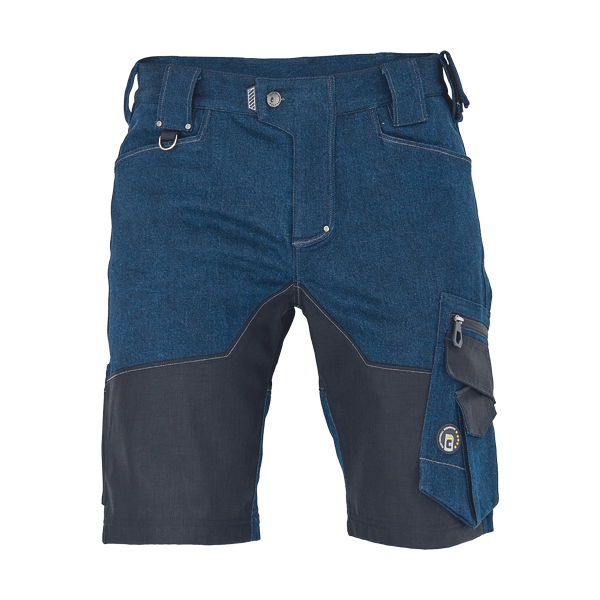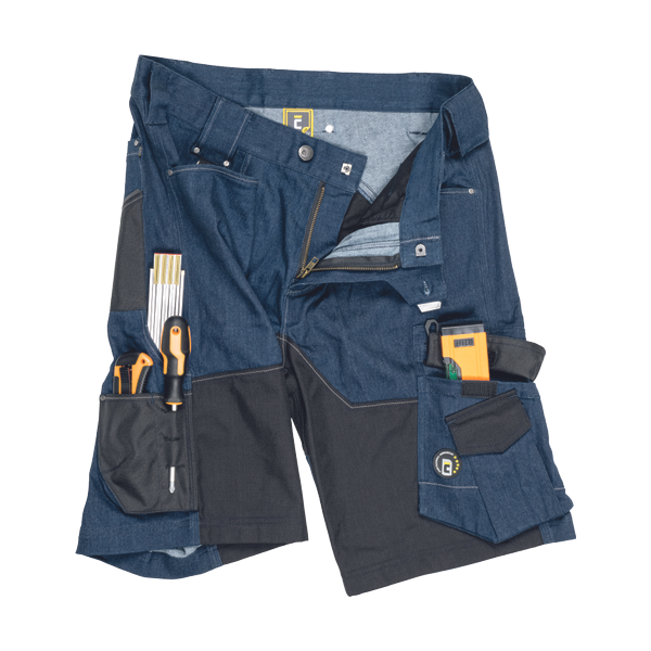 men's working shorts; pre-washed Denim fabric in combination with TRIFIBETEX PRO and TRIFIBETEX material; durable tripple stitching of legs and crotch, CORDURA and TRIFIBETEX reinforced thigh and crotch parts; spacious multifunctional front pockets with tool straps.