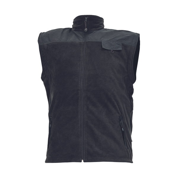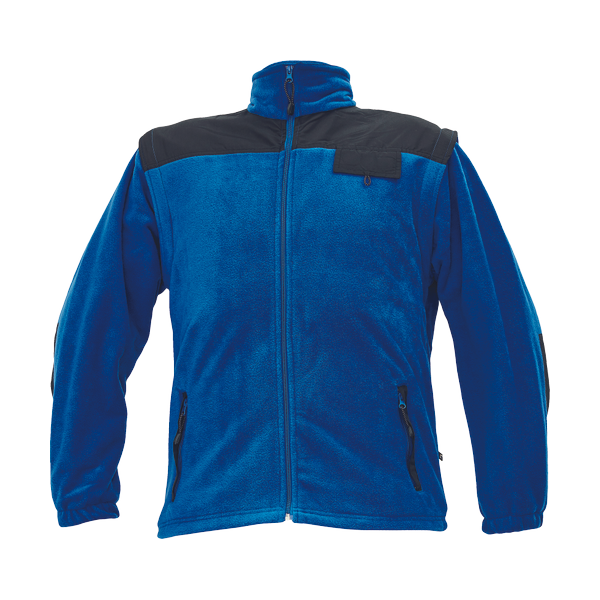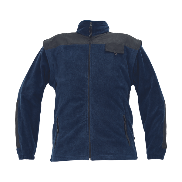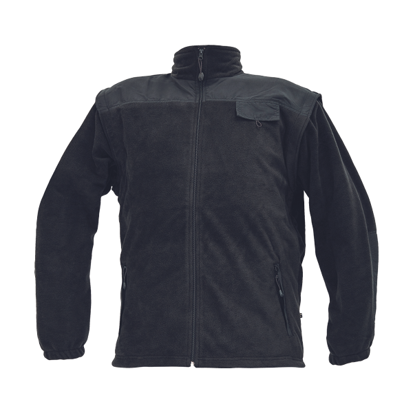 comfortable men's fleece jacket 2 in 1; removable sleeves; shoulders and elbows polyamid reinforcement provides higher durability and weather resistance; 2 side pockets, 1 chest pocket; elastic sleeve cuffs; antipilling treatment on the outer side.