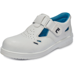 Light safety sandals with a steel toe cap, which protects against compression with a force of up to 15 kN or a load with a weight of up to 20 kg from a height of 1 m. The antistatic outsole made of single-density polyurethane guarantees not only comfort but also safety thanks to the anti-slip properties of the sole, which is also resistant to oils and abrasion. The upper of the shoe is made of light microfiber, which is very easy to maintain. The inner breathable lining has antibacterial properties and prevents odors. The velcro closing ensures quick and comfortable donning. The white-blue color combination is especially suitable in the food industry. This model is available in small sizes from 35.