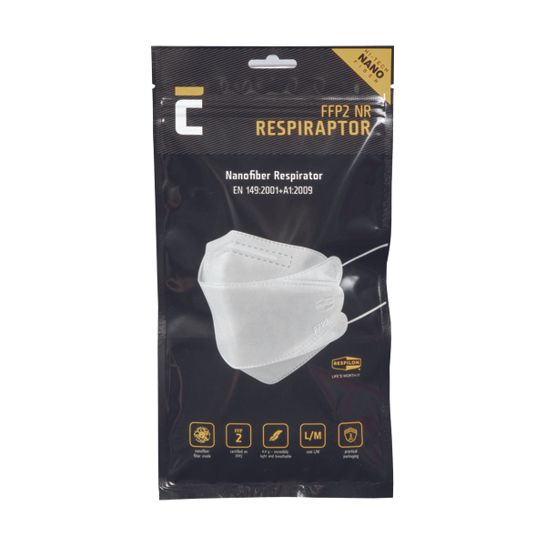 FFP2 NR RespiRaptor se může pochlubit filtrem z nanovláken, který má několik milionů pórů na jednom čtverečním cm. Zabraňuje vniknutí virů, bakterií, smogu a prachu do vašich úst a nosu. RESPILON® RespiRaptor je respirátor, který je schopen blokovat škodlivé látky pomocí vysoce účinného filtračního filtru z nanovláken. Vynikající prodyšnost -navzdory vysoké hustotě nanovláken je membrána RESPILON® propustná pro vzduch a vodu, což zvyšuje pohodlí a umožňuje snadné dýchání Snadné a pohodlné povídání. Pro lepší přizpůsobení použijte plastový háček za hlavu spojující ušní poutka, která je součástí balení. K dispozici ve velikosti M/L a dvou obalech (3 ks, 25 ks)