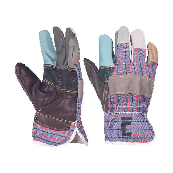 Gloves with furniture cowhide palm with lining and cotton fabric back and cuff.