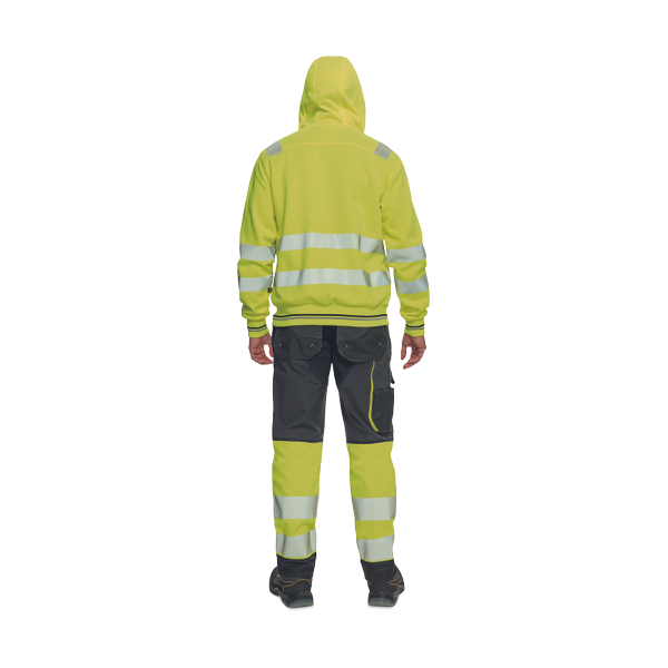 Mikina na zip ve verzi HI-VIS ze směsi polyesteru a bavlny; 2 reflexní segmentované potištěné pruhy o šířce 5 cm kolem boků, rukávů a přes ramena; uvnitř nečesané francouzské froté; dvouvrstvá kapuce a ozdobné prošívání; elastické lemy na rukávech a ve spodním dílu.
