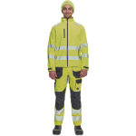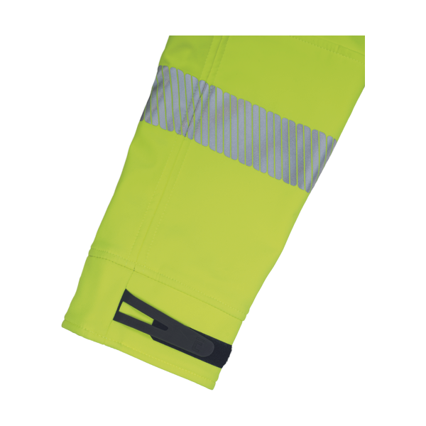 men's HI-VIS softshell jacket with membrane and inside fleece layer; 2 side zipper pockets, 1 chest zipper pocket; 3 multifunctional inner pockets; 2 reflective segmented printed 5 cm width stripes around hips, sleeves and across shoulders; adjustable sleeve hems with velcro; decorative piping and stitching in contrast colour.