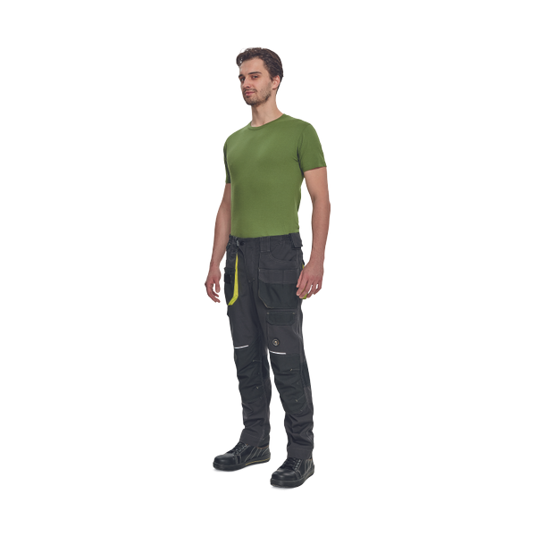 men's workwear pants with elastic waist and multifunctional pockets; Oxford 600D reinforcement of knee pockets for knee pads insertion; durable triple stitching of legs and crotch; reflective piping; extendable legs length.