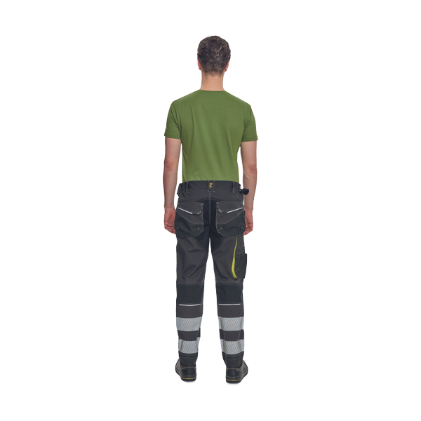 Pánské pracovní kalhoty s elastickým pasem a multifunkčními kapsami; výztuha z Oxford 600D pro vložení chráničů kolen; odolné trojité prošívání nohavic a rozkroku; reflexní lemování, spodní část nohavic s 7cm reflexním potiskem a segmentovanými pruhy; prodloužitelná délka nohavic.