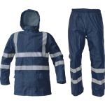 waterproof and windproof set of jacket and pants; ¾ overcoat with a hood in the collar; pants with elastic rubber waist; reflective jacket stripes around chest, hips, sleeves and across shoulders; reflective stripes around bottom part of legs, jacket with 2 flap front pockets; bottom sleeve rim adjustment by poppers; HI-VIS version in yellow and orange colours.