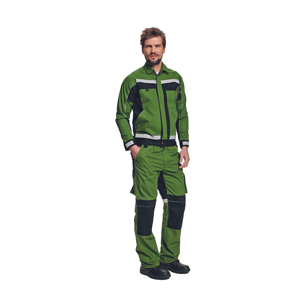 high durable workwear men's jacket with zipper closure covered with metal popper closure placket; 2 big front pockets; 2 chest pockets with velcro flaps; popper adjustment of sleeve width and bottom hem; reflective elements.