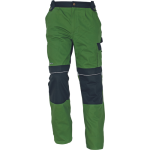 high durable workwear men's pants with metal zipper closure and poppers, elastic waist; 5 functional pockets; loops for small tool; reinforced knee parts with pockets for knee pads insertion; reflective elements.