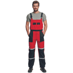 men's working bib pants with elastic waist; oil and water resistant impregnation; 6 functional pockets; elastic braces with plastic buckles; reflective stripes.