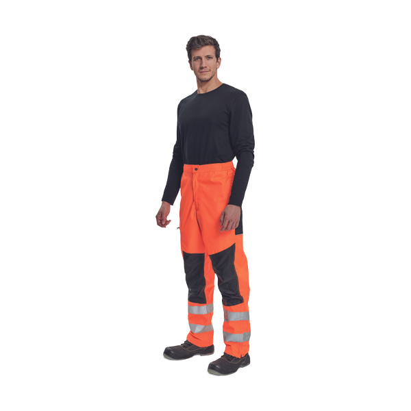 men's waterproof HI-VIS pants with reflective stripes under knees; sealed seams, permeable; adjusted waist with velcro; bottom legs rims with zipper slits; knee and seat part reinforcement.