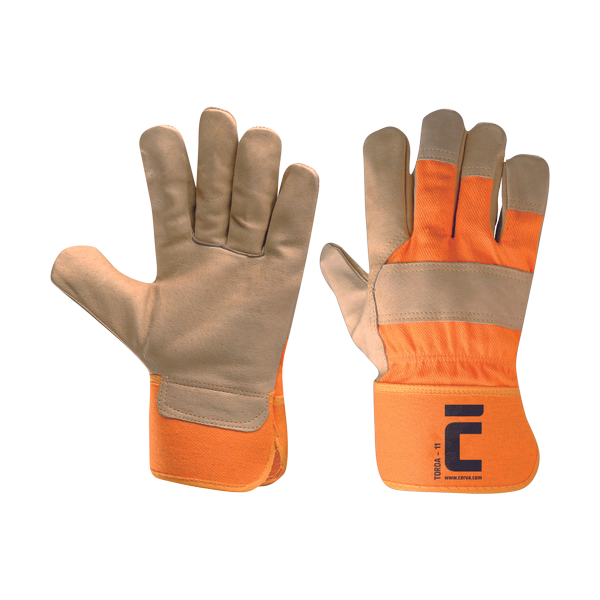 Gloves with fine grain leather palm and fingers and quality cotton back.