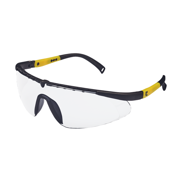 Optical class 1 sport look glasses with polycarbonate lens with anti-scratch, anti-fog coating (class F according to EN 166 standard), small energy shock protection and adjustable temple length. Yellow lens has a UV protection filter according to EN 170 standard, grey lens has a sunglass filter according to EN 172 standard.