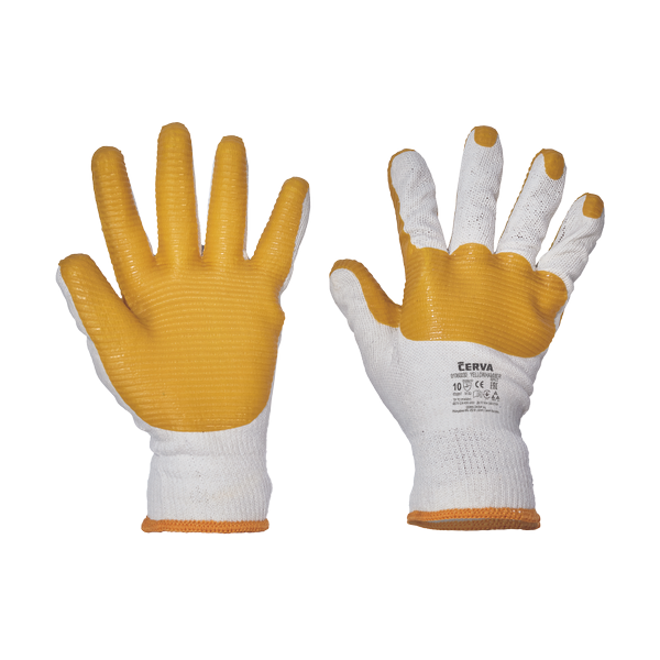 Knitted gloves made of strong polyester/cotton blended yarn, latex impregnated. The layer on the back of the gloves ensures the additional protection of the joints.