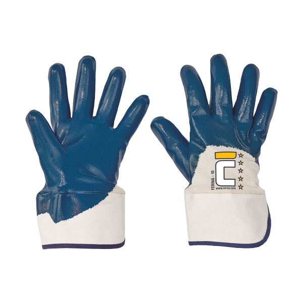 Sewn gloves from cotton jersey, partially nitrile coated (non-skid grip) and wide cuff with possibility to cover clothes. Gloves are suitable for abrasive materials manipulation in heavily oily environment.
