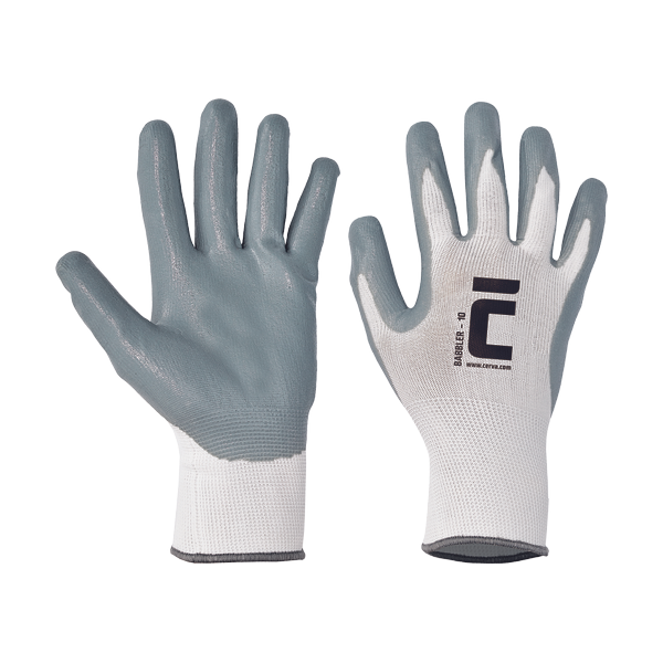 Knitted seamless nylon gloves, with microporose nitrile layer on palm and fingers and elastic cuff.