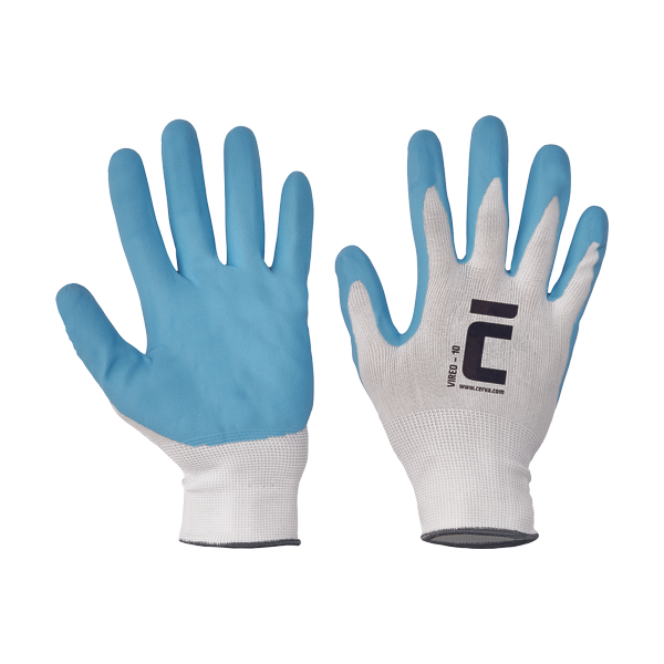 Knitted seamless nylon gloves, with a breathable foam nitrile layer on palm and fingers and elastic cuff.